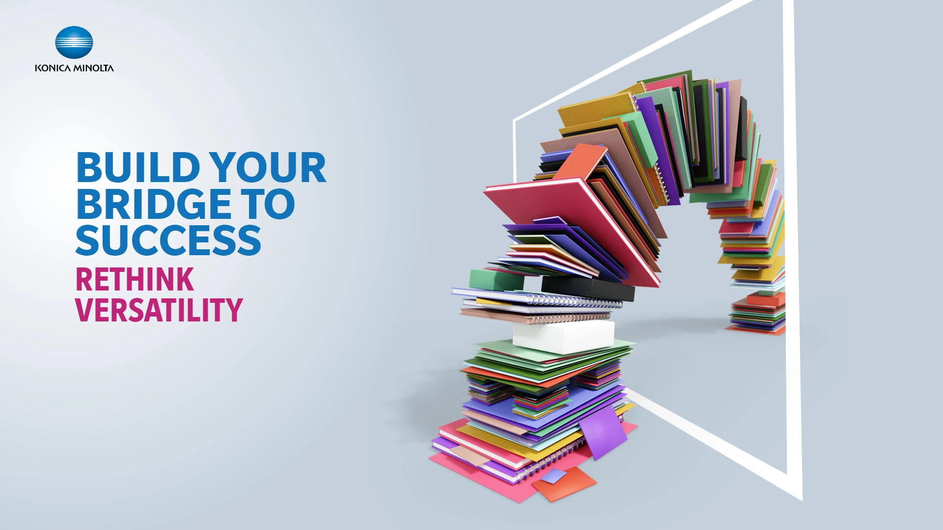 A strategically designed B2B campaign for Konica Minolta's latest versatile printer. The printer is so versatile and overcomes technical limitations that we positioned it as something that 'builds bridges', allowing businesses to access previously untapped markets. With the Accuiropress, the gap between vision and reality is closer than ever before. For the key visual I developed a classic 3D arch bridge constructed of all the different substrates the printer can use. This design was flexed across material including brochures, technical documents, LinkedIn posts and interactive web banners.